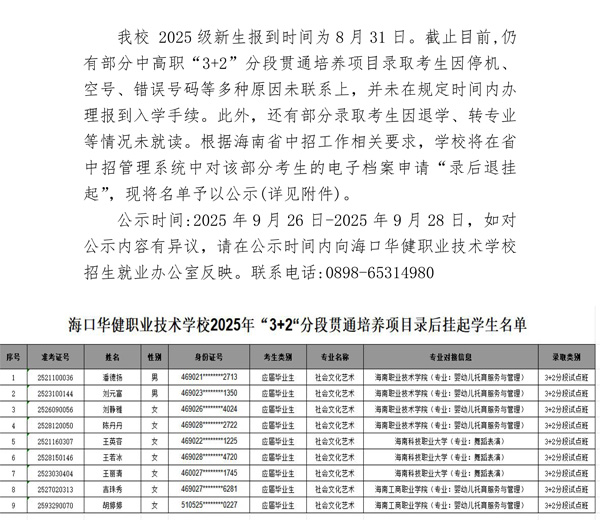 海口华健职业技术学校关于2025年中高职录取后挂起名单公示